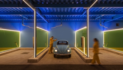 La propuesta lumínica de MAYCAN ha transformado completamente este espacio, implementando "un juego visual que no solo llena de color el interior sino que también abre el taller al exterior, creando una atractiva identidad visual".