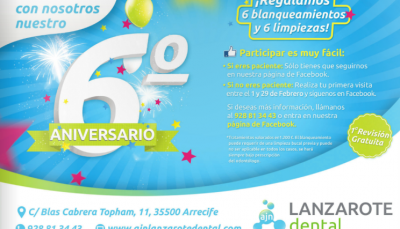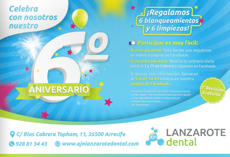 Por ello ajn Lanzarote Dental, regalará entre sus pacientes, y los nuevos, hasta el día 29 de febrero de 2016, 6 limpiezas y 6 blanqueamientos. Habrá 12 ganadores, que serán recompensados por la confianza mostrada durante estos años.