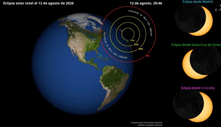 The peculiarity of the solar eclipse on August 12, 2026 is that it will be accompanied by two more on August 2, 2027 and January 26, 2028, which can be seen from the Iberian Peninsula, a concatenation of three that has motivated Spanish planetariums to undertake the 'Eclipse' project.