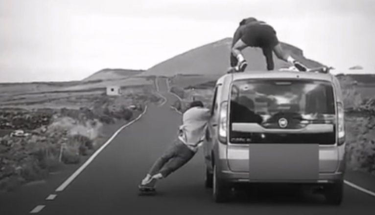 At the same time, a third person travels on a skateboard attached to the driver's door frame and parallel to the vehicle barely maintaining balance and making dangerous lateral movements from the moving vehicle.