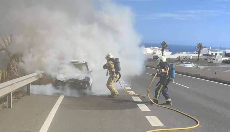 A vehicle in motion was completely engulfed in flames on the LZ-2 highway, southbound, near Tías.