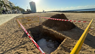 Since Thursday night and throughout Friday morning, a mechanical shovel and two workers from the Arrecife City Council have dug two holes on the beach to clarify where the leaks are occurring and to stop them.