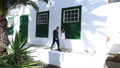 The president of the Cabildo of Lanzarote, Oswaldo Betancort, and the island Corporation's Handicrafts counselor, Aroa Revelo, visited this Monday the rehabilitation work being carried out on the well-known Casa del Cura, located at Encarnación Rodríguez Lasso street number 1, in the town of Haría.