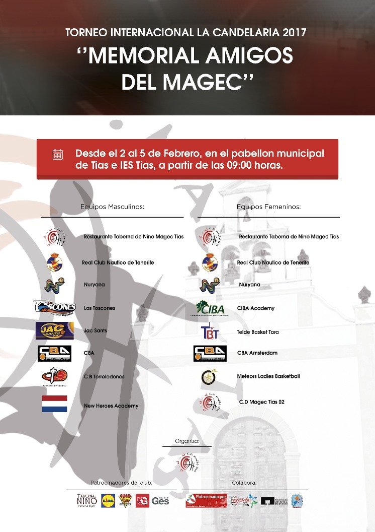 The XX La Candelaria International Tournament 2017 "Memorial Amigos del Magec" is organized by the Club Deportivo Magec Tías. It is sponsored by the Taberna de Nino Restaurant, Lidl, Hamburguesería Cuco and Seguros GES and with the collaboration of the Island Sports Service of the Cabildo de Lanzarote, Department of Sports of the Tías City Council, Canary Basketball Federation and Island Basketball Delegation of Lanzarote.