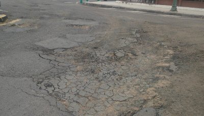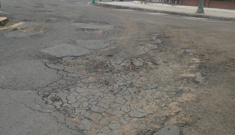 As can be seen in the images, this area has **sinkholes** in practically all of the asphalt, which **hinders vehicle access**. Furthermore, this occurs right in front of the entrance to two hotelsIn this regard, he states that the area "is a disgrace and they don't fix it..., everything is very neglected."Likewise, the neighbor also criticizes that they have put up a no stopping and parking sign in the loading and unloading zone