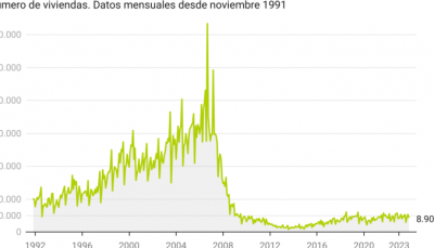 El problema, que se da en toda España y en otros países, tiene su raíz principal en la falta de oferta inmobiliaria y esta falta de oferta se da por una serie de factores estructurales y coyunturales. Falta de oferta es sinónimo de dos cosas, de que no se construye lo suficiente desde la Gran Recesión de 2008 y de que no existe la suficiente seguridad jurídica para que los propietarios pongan sus propiedades en alquiler, inseguridad jurídica agravada durante los últimos años del gobierno nacional, el único con capacidad real de mover montañas en temas tan complicados y de naturaleza multifactorial. El siguiente gráfico es el número de nuevas viviendas construidas en España y el dato habla por sí solo. Casi no se crea oferta desde hace 16 años, a pesar de que la población ha crecido y de que cada vez más personas viven solas o con menos miembros en la unidad familiar.