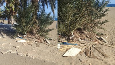 En las imágenes enviadas a este medio se aprecia basura acumulada en la arena, desde tablas de madera junto a palmeras hasta escombros dispersos en la playa, así como plásticos, botellas y restos en la avenida principal. También se puede ver cómo las hojas secas se combinan con desperdicios, tales como latas de refresco, botellas de cristal y colillas alrededor de los árboles y basura bajo los bancos urbanos.