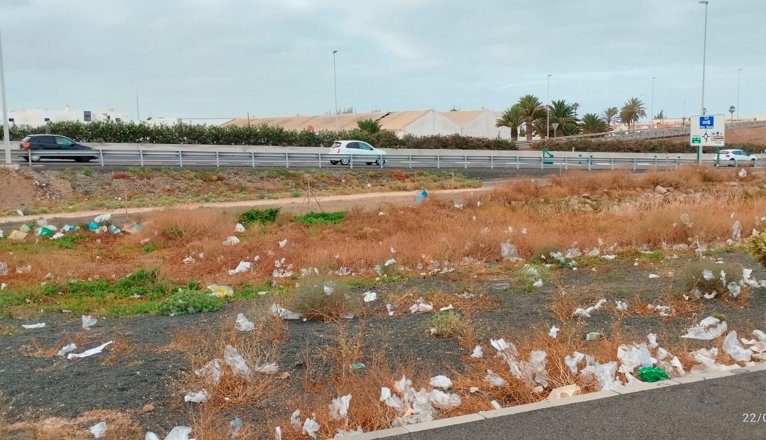 En las fotografías remitidas a este medio se pueden observar los residuos en toda la zona. Con las condiciones de viento habituales en la isla y su cercanía al litoral pueden acabar en el mar.