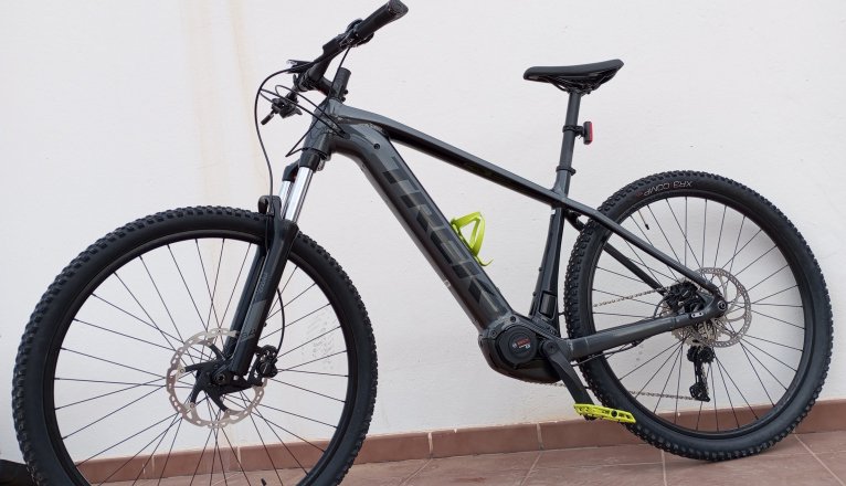 Se trata de una bicicleta de montaña de la marca Trek Powerfly4 de color gris oscuro metalizado con pedales amarillos fluorescentes.