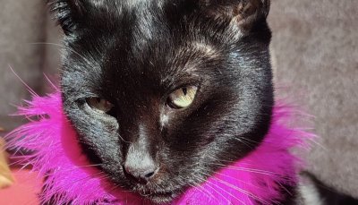 El animal es de color negro, hocico y labios negros, ojos amarillos y tiene el rabo más corto porque se lo cortó con una puerta. Además, en la punta del mismo no tiene pelo.
