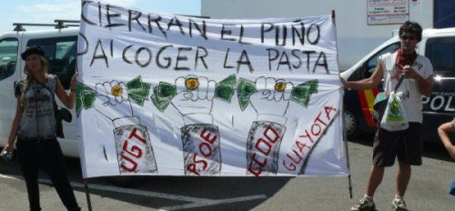 En concreto, en la pancarta aparecen tres puños cerrados con varios billetes en los que se ven las palabras CCOO, UGT y PSOE, bajo una frase que no deja lugar a dudas: "Cierran el puño pa' coger la pasta".